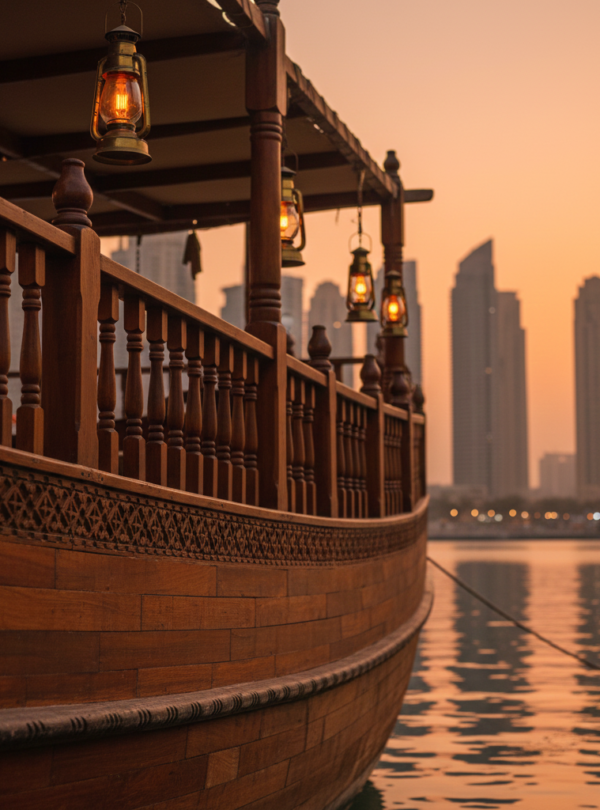 The first that awaits you on your Dhow Cruise Dinner in Dubai Marina experience is a complimentary welcome drink. After that, you will settle in the dhow’s lower air-conditioned deck or head up to the partly open upper deck. This unique Marina Dubai Cruise offers breathtaking views of the surroundings while you dine on delectable international cuisines (including a four-star menu) in a sophisticated setting that exudes traditional charm.